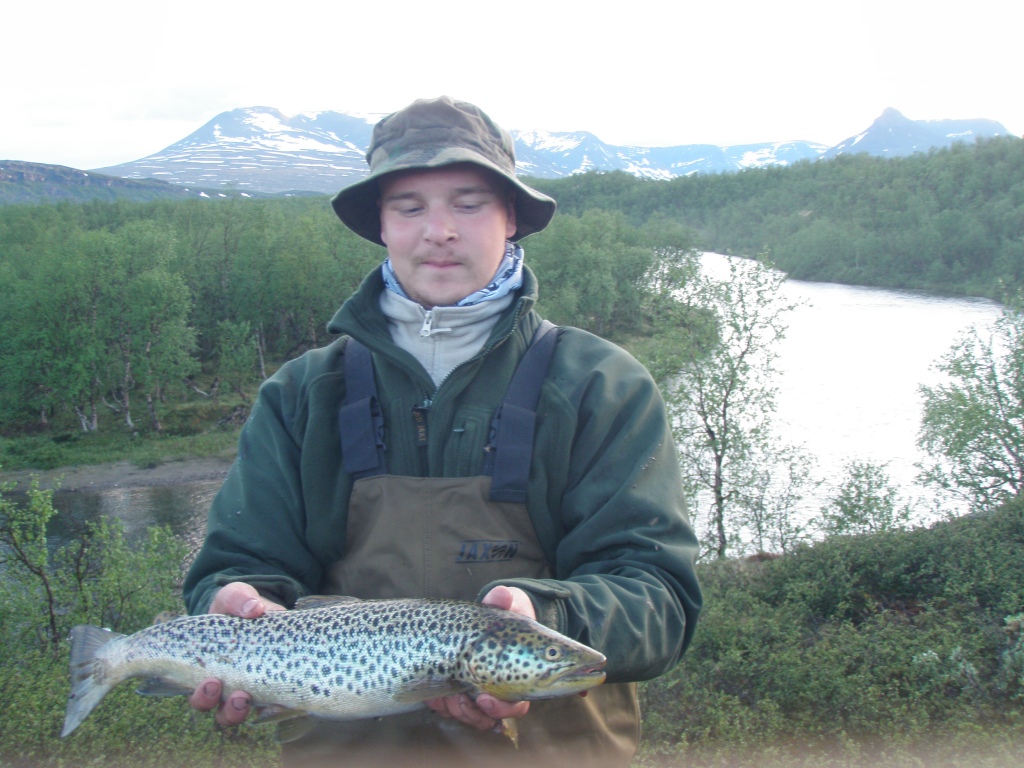 Leiriin päästyämme olimme teltassa sateen suojassa, ilmoille pääsi ajatus lähteä läheiselle pienelle sivujoelle taimenta kiusaamaan, niin tapahtui sateen lakattua ja ukkosen jyristyä. Minä ja Embo lähdimme, Jata jäi nukkumaan. Joelle päästyämme taimenia tuikki, laitoin mato-ongen siiman päähän ja Embo pelkän koukun ja tukon matoja. Embon koukku irtosi ja hän lähti hakemaan uutta, otin huikan salmaria povitaskusta ja ennen kuin kerkesin laittaa pullon takaisin huomasin suuren pyörteen joki mutkassa n.10 metrin päässä, nakkasin ongen sen lähelle ja käänsin päätäni laittaakseni pullon kiinni ja takaisin taskuun. Vilkaisin kohoa, sitä ei näkynyt missään, kelasin siimaa puolalle ja jytinä alkoi, tein varmuudeksi vastavedon ja väsytys alkoi. Pintaan, pohjalle, vasemmalle, oikealle ja lopulta vastarannalle varvikkoon, sehän pääsee kohta irti. Kiristin jarrua hieman ja kelasin kalaa luokseni, se kävi pinnassa ja näin sen olevan hyvän kokoinen taimen, sain nostettua sen ylös, jalat tärisivät innostuksesta, kirkas ja tummatäpläinen taneli oli käsissäni. Lähdin viemään kalaa leiriin ja puntaroimaan sen 1.14kg ja hk recordini! Palasimme joelle koko porukalla ja onnistuimmekin saaman muutaman taimenen lisää, mutta päästimme ne kasvamaan.