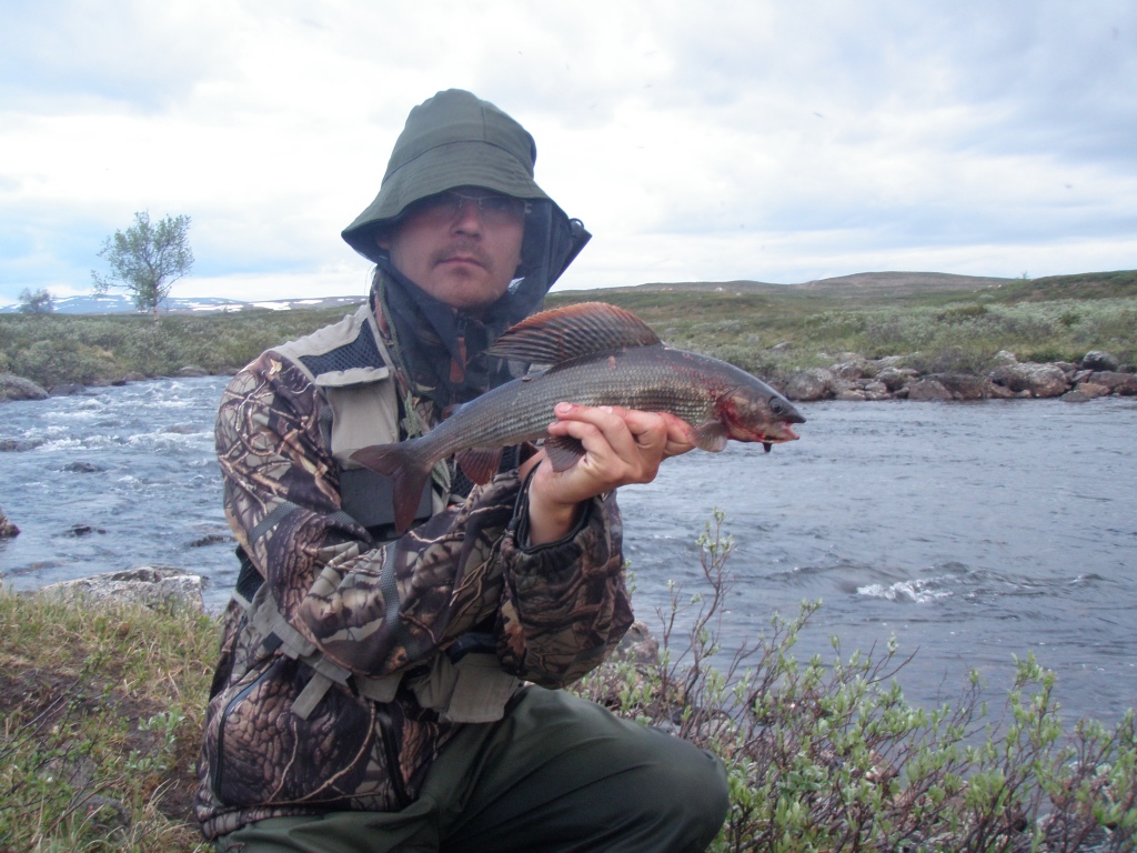 Unta riitti aina iltaan saakka, oli turvauduttava mukana tuomiimme eväisiin ja puraistava ennen lähtöä.. Menimme joen yli ja kuljimme useita kilometrejä ylävirtaan, lähdimme seuraamaan pientä sivujokea ylöspäin ja saavuimme mahtavan näköiselle harripoolille. Lottoa siimanpäähän ja uistin veteen.. tärppejä tuli alussa koko ajan, mutta heti ei tarttunut. Auringon laskettua alkoi ahnas syönti, harreja nousi toinen toisensa perään ja eksyipä joukkoon pari pikku taimentakin, vapautimme ne välittömästi. Seuraavalla poolilla sama meno jatkui ja seuraavalla ja... saimme kaikkiaan 45 harjusta ja 3 taimenta, iskipä väliin se harrikuumekin, mutta se hiipui muistuttaessa itseämme siitä, että leiriin on kuitenkin vielä 6 km kävely... Paistoimme nuotiolla yhden mitallisen taimenen ja 2 harjusta, mausteet jäivät leiriin, mutta nälkä on paras mauste, se saa kaiken maistumaan! Otimme myös muutaman harjuksen leiriin, kannoimme mukananmme halsterin jossa harrit valmistimme, hyvää, muttei vedä vertoja raudulle!