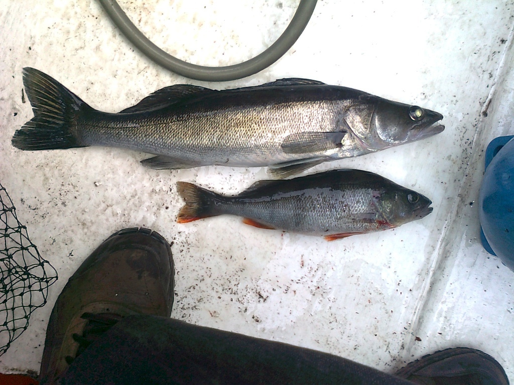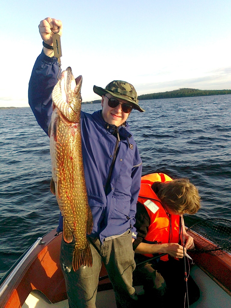Aamulla heräsimme yhdentoista aikaan, söimme aamupalan ja lähdimme pyytämään ahdilta armoa. Sää oli melko tuulinen. Aloitimme taas perinteisesi uistelemalla. Eipä kauaa kestänyt kun kova sade yllätti ja kasteli meidät. Vapa alkoi taas vistpata suurinpiirtein samoilla leveyspiireillä, kuin eilenen hauki, mutta nyt siellä ei ollut aivan niin raskasta tavaraa. Kelatessamme pois huomasimme vain jonkun "pienen" pyörivän veden alla kuin hyrrä. Lähemmäs vedettyämme huomasimme, että se oli kunnon körmyniska ahven. Painoa oli punkerolla noin 400 grammaa. Ahven iski Waken Jiveen. Jatkoimme matkaa. Sadekkin loppui melko nopeasti. Hetken kuluttua seuraava vapa alkoi väpättää. Tällä kertaa vavan toisessa päässä, kiiltelevän sinisen vaapun ympärillä oli arvostettu herkku: kuha. Kuha oli ihan syötävän kokoinen, noin 1,3 kg. Tämän jälkeen siirryimme mökille syömään herkut, mutta ensin oli tietysti saunottava. Fileeksi meni nämäkin kalat ja kyllä maistui! Syötyämme kalat ryhdyttiin vielä grillaamaan vähän kana vartaita. Lähdimme sen jälkee satamaan kohti, mutta ajattelimme, että eiköhän vedetä vielä vaappuja perässä matkalla. Näin teimme. Kun noin puolet matkasta oli tehty, toinen kaverini oli veneen keulassa, toinen keskellä puhelin korvallaan ja itse ohjasin paattia. Yhtäkkiä pitkin ja jäykin vapa alkoi vääntyä kunnolla ja tästähän tuli kunnon kaaos. Kaikki noustiin vetämään paksua vapaa ylös vapatelineestä, perkele kun tuli hieman pienehköt reijät kyseiselle vavalle, ja vieläkun toisessa päässä siimaa tuntui raivokas riuhtominen. Vene ehti pyöriä kerran ympäri ennenkuin saimme vavan irti vapatelineestä. Eikun vene suoraksi ja sieltähän se kalakin tuli, mutta kyllä siihen tarviti jotain muutakin kun rauhallista kelailua, nääs nyt oli siimanpäässä jotain isoa. Se oli hauki. Kun saimme hauen veneen vierelle, meille tuli pieniä -tecnical problems-:sia haavin kanssa kun kala ei tuntunut mahtuvan koko roskaan. Noh yksi kalamiehistä uhrautui ottamaan kalan kaksin käsin veneeseen. Hauen hampaat oli tosin erimieltä kun upposivat kalamiehen sormeen. Pääasia oli että jytku oli veneessä. Se oli iso (näin aloittelioiden mittapuulle). Selvitimme sotkut siimoista ja löimme kalan tajuttomaksi. Vanha ruosteinen kalavaaka näytti kalan painoksi 6 kiloa. Se oli "lyhyt" , mutta lihava. Jatkoimme matkaa uistellen, kuintenkin saamatta enää mitään. Laiturille päästyämme matkamme erkanivat, mutta päätimme kyseiset kalastajat tulevat minun luokse seuraavana päivänä maistamaan kalaa, ja tekemään vaappuja. Kotona punnitsin kalan luotettavalle vaa-alla ja mittasin mitalla. Painoa otuksella oli 5,4 kg ja pituutta 90 senttiä. Valitettavasti kuvat ovat puhelin kuvia, joten laadusta ei voi odottaa hääviä.
