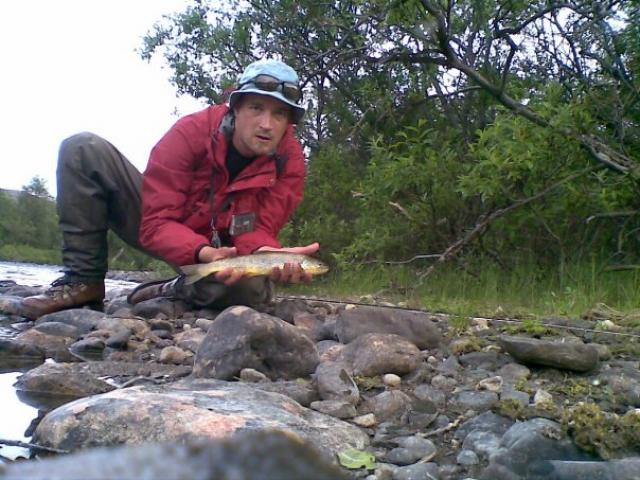 Nukutun yön jälkeen Rema tonnista aamupalaa. Desifiointi paikallisella suomea osaavalla hepulla ja luvat Cabardakselle Statoililta. Joelle klo 14. Kalastusta haittsi kovaksikin äitynyt pohjoistuuli, joka ilm. vei kaloilta syömähalukkuuden. Joella suomalaiset olivat saaneet pieniä taimenia sekä päivällä että illalla.(yksi iso myös hetken kiinni)