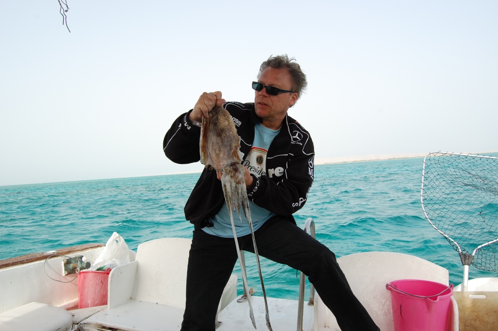 Kalmari tarttui toiseen kalaan morganaan,mutta laski irti pinnalla, laitoin morganan uudestaan mereen ja Kalmari tarttui pikku kalaan tiukasti pysyi niin kauan että saatiin haavi esille. Veneen perä ja osa vaatteista olivat sen jälkeen mustetta mustanaan