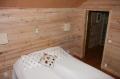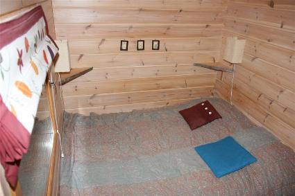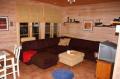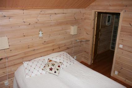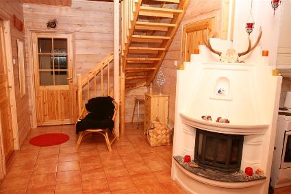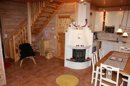 Alakerrassa: tupakeittiö, takka (hinta sisältää takkapuut), ruokapöytä 6-8:lle sekä oleskelutilassa massiivinen kulmasohva. Yksi makuuhuone, jossa kaksi sänkyä. Sauna aina valmiilla kiukaalla, pesuhuone/wc. Yläkerrassa: kaksi makuuhuonetta, joissa kummassakin parisängyt, lisäksi yksi vauvan sänky (matkamalli) sekä varapatjat kahdelle.